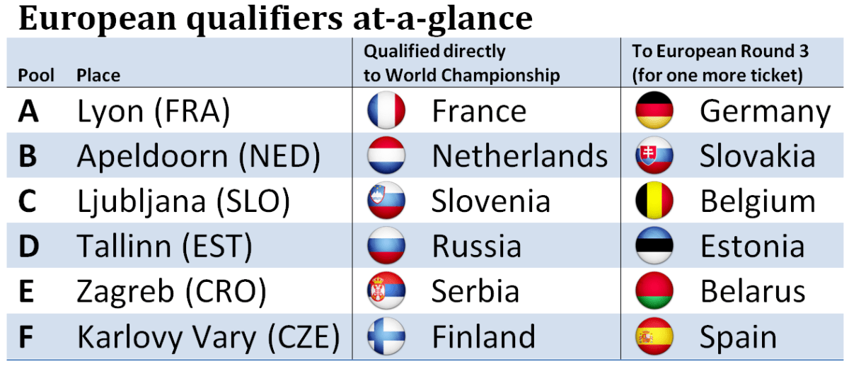 Ranska,Hollanti, Slovenia, Venäjä, Serbia ja Suomi selvittivät tiensä MM-kisoihin Euroopan miesten karsintalohkoista.