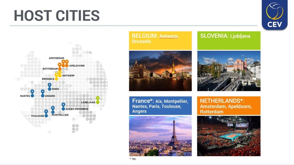 EM-kisat järjestetään 13.-29.9.2019. Kisakaupungit kussakin maassa vahvistetaan myöhemmin tänä vuonna. Se tiedetään jo, että Sloveniassa pelataan Ljubljanassa ja Belgiassa Antwerpenissa sekä Brysselissä. Ranskalla on vielä kuusi vaihtoehtoa ja Hollannilla kolme.