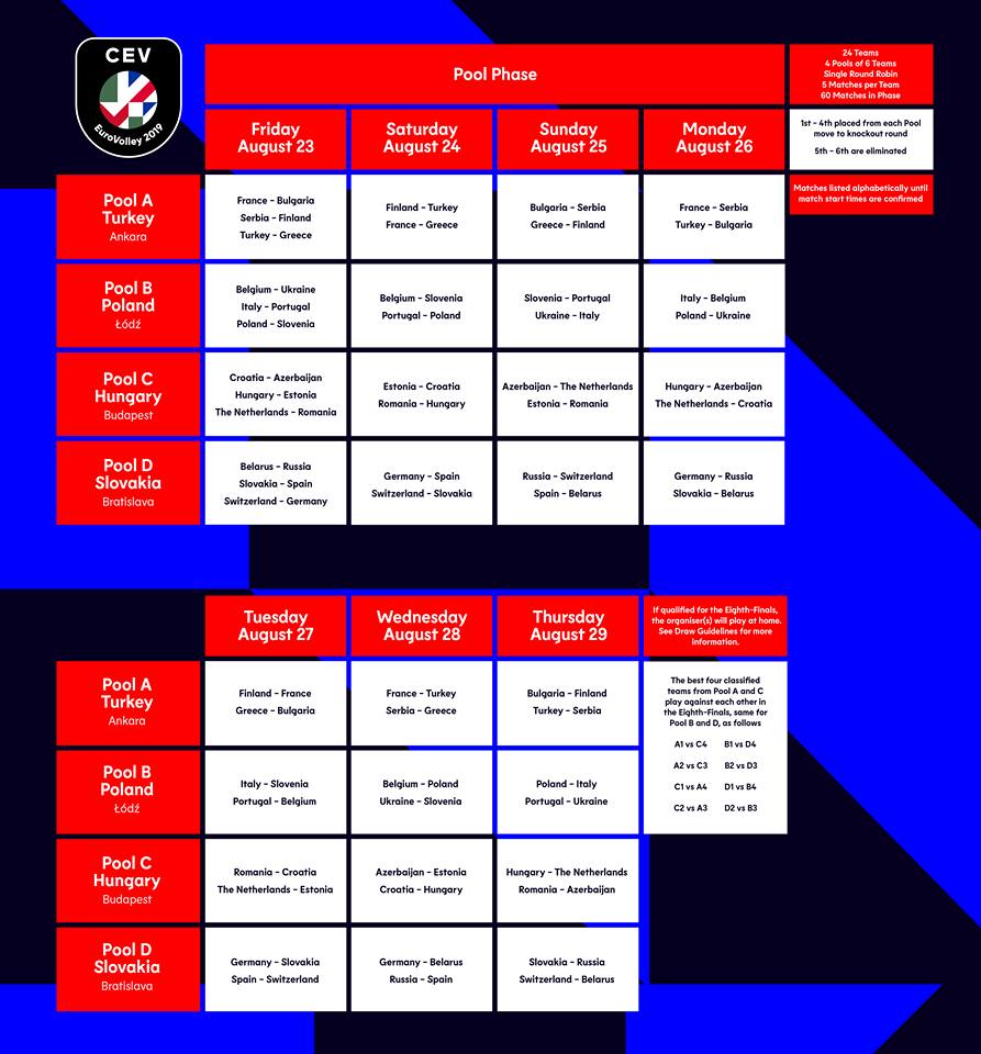 Alkulohkot sekä neljännesvälierät pelataan kaikissa neljässä maassa. Puolivälierät pelataan Turkissa ja Puolassa. Välierät sekä pronssi- ja loppuottelut pelataan Ankarassa, Turkissa.