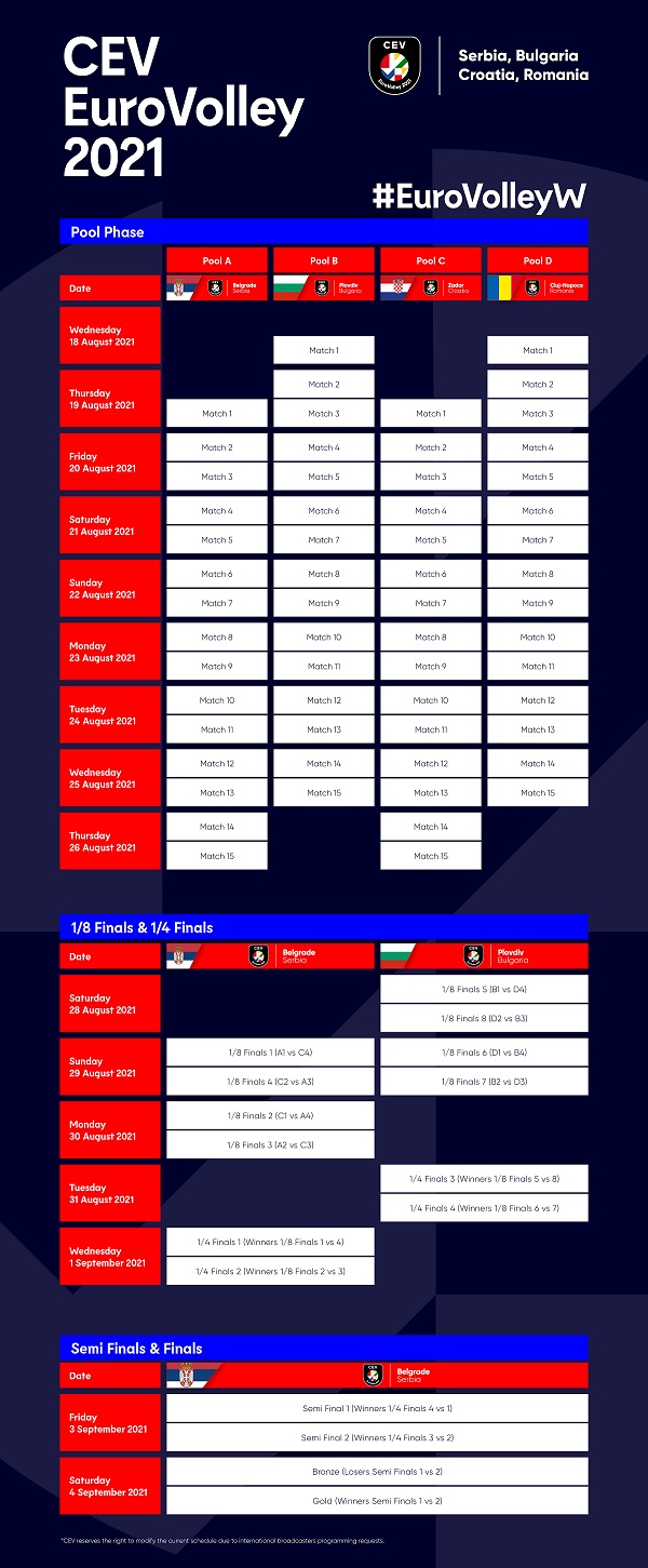 Syksyn EM-kilpailujen pelaamisesta tuli ilmoille lupaava signaali, kun CEV julkisti naisten kisakaupungit. Pudotuspelien kaksi kierrosta pelataan puoliksi Belgradissa ja Plovdivissa. Välierät ja mitalipelit nähdään Belgradissa 3.-4. syyskuuta.