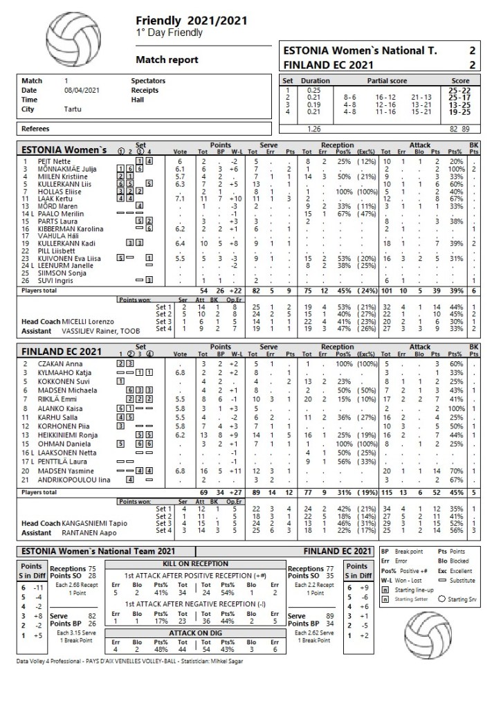 Tilastojen perusteella Yasmine Madsen ja Ronja Heikkiniemi olivat Suomen ykköspelaajat. Piia Korhonen ja Suvi Kokkonen toisaalta pelasivat vain ensimmäisen erän ja tekivät siinä mukavasti pisteitä. Kertu Laak oli Viron paras pisteentekijä.